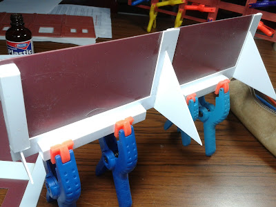 The ACME building fits an odd space along the backdrop, so using my paper templates, I cut a base and roof from a sheet of .040" plain styrene. From scrap pieces I added corner braces to attach the side walls and square tubing to support the roof.